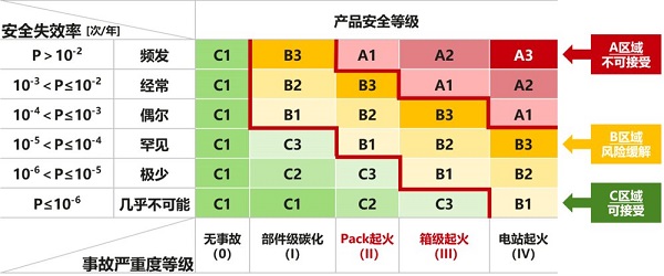 华为数字能源联合提出的评估体系将储能系统安全风险由高至低分为A(不可接受)、B(风险缓解)、C(可接受)三个等级,并明确了各等级对应的失效概率要求。其中,A级风险极高,系统安全风险完全不可控,重大安全事故概率极高;B级风险较高,必须通过持续优化产品设计与引入创新技术以降低风险;C级为安全风险总体可控,可有效避免整站火灾等严重后果。