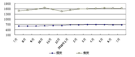 煤炭价格总体平稳。7月份,主产省煤炭平均出矿价格为每吨711元,比6月份略降0.49%。其中,动力煤平均价格为每吨517元,比6月份略降0.65%。主产省焦炭平均出厂价格为每吨1535元,比6月份下降2.22%。主要煤炭中转港秦皇岛港动力煤平仓价每吨689元,比6月份略降0.24%。