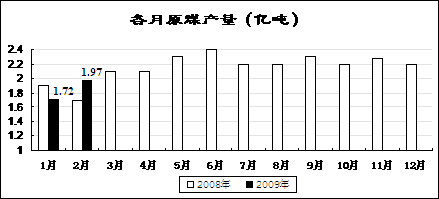 从国家发展改革委网站获悉,1-2月,全国原煤产量3.69亿吨,同比增长3.6%,增速同比减缓9.8个百分点。煤炭行业实现利润206亿元,同比增长15%,增幅同比回落51.8个百分点。国家铁路完成煤炭运量2.01亿吨,同比下降9.6%。煤炭供求形势总体较为宽松。
