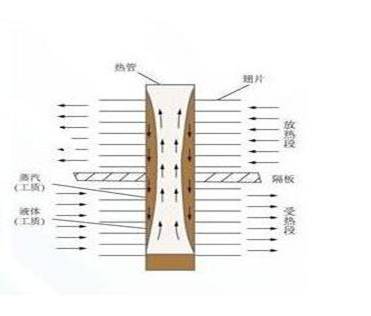 典型热管是密闭的管内先抽成一定真空后,充入导热介质密封而成(导热介质由多种无机活性金属及其化合物混合而成,无毒、无味、无腐蚀,其导热性能是铝、铜的几百倍,具有“超导热体”之称),热管换热器中间有隔板分开,上下互不干扰,其下端从烟气侧吸热,导热介质吸收热量后汽化由液态转变为气态,上升到热管上端向管外工质放热后凝结为液体,液体在重力作用下,沿管壁返回到受热段并再次受热汽化,如此循环反复连续不断地将热量从一端传向另一端,其结构图如图1所示。