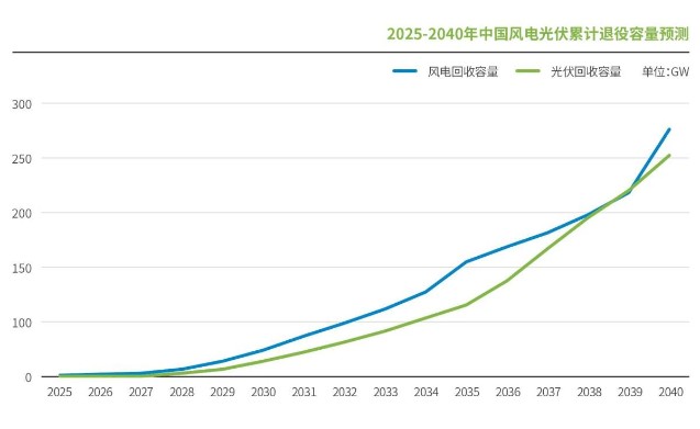 报告预计,中国风电产业将在2025年迎来第一批大规模退役潮,退役规模将超过1.2GW;紧随其后的是,2030年光伏组件将进入密集报废期,预计可回收容量高达17.8GW。到2040年风电退役累计将达到约280GW,光伏退役组件累计规模将达到约250GW。