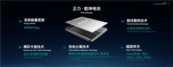 正力新能源根据自身特色,设计了一款以高安全性、高能量密度、超快充电和可拆卸为核心的动力电池——正力·乾坤电池。它具有高集成化、热电分离、极柱冷却、以及通过榫卯卡接的创新结构设计,实现了电芯可更换的技术特性。