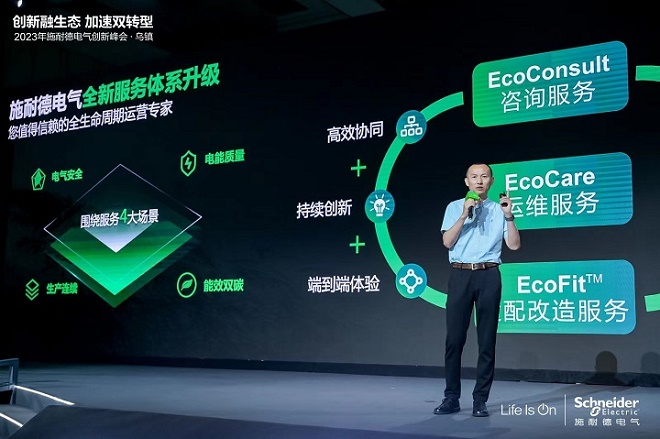 今天,以“创新融生态,加速可持续”为主题的2023年施耐德电气创新峰会隆重举行。活动现场,施耐德电气重磅发布全新升级服务体系,通过持续创新,为客户提供EcoConsult咨询服务、EcoCare运维服务和EcoFit™适配改造服务,打造端到端全生命周期服务能力,协同服务合作伙伴,助力客户加速数字化和绿色化双转型,迈向高质量可持续发展。