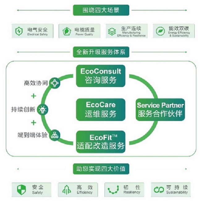 • EcoConsult咨询服务:施耐德电气EcoConsult咨询服务依托资深行业专家顾问,借助先进的软件和数字工具,通过现场调研、数据采集、诊断评估、报告交付、方案实施等,为客户提供从规划到落地,从绿色能源管理到绿色智能制造,从现场操作层到运营管理层的可执行洞察建议及关键服务成果,助力客户加快数字化和绿色化双转型,迈向可持续未来。