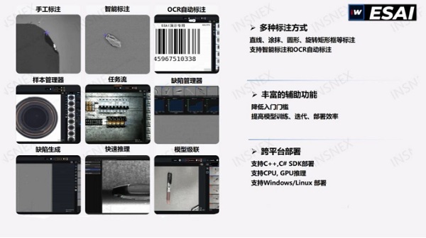 针对少样本与多型号的难题,借助INSWORKS-ESAI的缺陷生成工具,无需大量真实样本,用户借助智能标注功能即可快速生成缺陷模拟,从而降低使用门槛、缩短样本收集周期。此外,面对频繁换型,AI模型的自适应能力也可有效缩短换型时间,适配多型号生产场景。