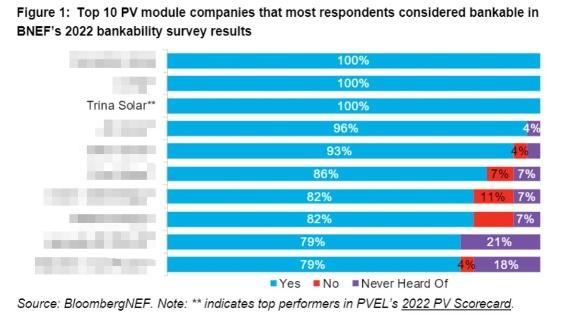 BNEF以公司的财务健康状况、光伏组件在项目上的跟踪数据以及制造厂商的质保为重要评估指标,向全球银行、基金、工程总承包以及独立发电厂等机构发送调查问卷,并与质量检测及技术专家进行深度访谈,调查覆盖范围广,评估公开透明。BNEF是全球新能源市场最具公信力的第三方研究机构之一,其报告长期以来是众多金融机构在商业信贷方面的重要参考依据。