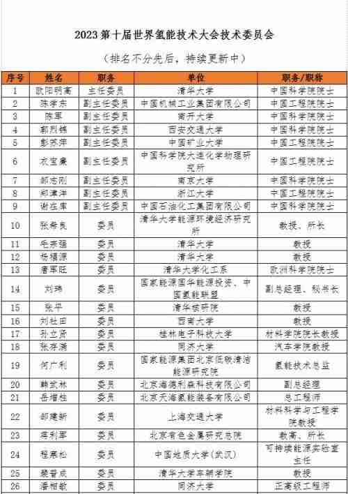 WHTC2023技术委员会由欧阳明高院士担任主任委员,陈学东、陈军、郭烈锦、彭苏萍、衣宝廉、邹志刚、郑津洋、谢在库等8位院士担任副主任委员。此外,国际氢能协会副主席毛宗强教授,加拿大工程院院士王海江、叶思宇、欧洲科学院院士唐军旺等近70位业界领军学者、专家出任委员,阵容强大。