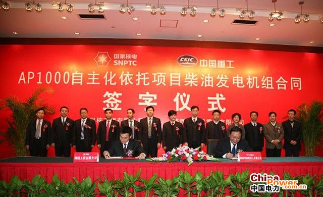 1月15日,我国第三代核电AP1000自主化依托项目柴油发电机组采购合同在西安签订。国核工程公司采购中心副主任黄忠平与陕柴重工有限公司副总经理王洪分别代表双方在合同上签字。此次采购的范围包含我国三代核电AP1000自主化依托项目浙江三门核电站一期工程和山东海阳站一期工程4台核电机组的8台柴油发电机组。
