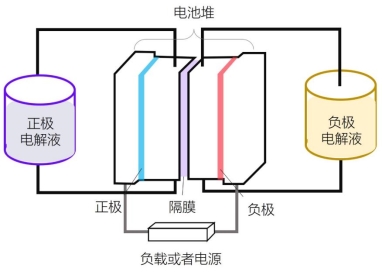 液流电池作为电化学储能技术之一,其将阴阳极电解液分别通过管路推入电堆中,通过活性元素的价态变化,在电能和化学能之间产生转换来实现充放电。由于液流电池是将能量储存于水性电解液中,且能量转化不依赖于固体电极,因此没有燃烧爆炸的风险,符合储能的安全需求。