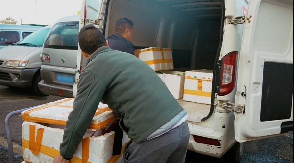 “行啊,今天应该轻松点,你别说十一高峰期是真猛,每天1吨多的螃蟹连续送7天,得亏我那车货厢有7个方了,每天一趟就运完了,不然我今天铁定是扛不住了。”喻师傅回应道,手上也忙活不停,麻利地清货、搬蟹,不一会的工夫,两人就合力将螃蟹都装进了车厢。确认泡沫箱都摆放得稳稳当当之后,喻师傅关上了后车厢门,连上蓝牙、选好歌曲,哼着歌,迎着灿烂的朝阳,向各大送货点驶去。