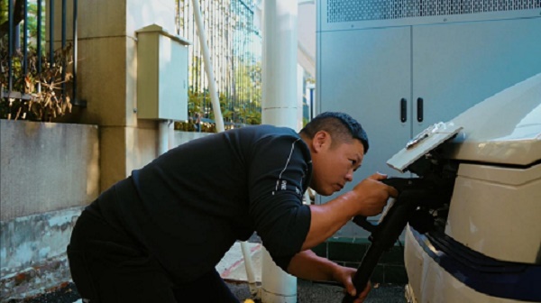 (趁午餐时间,喻师傅给东风御风EM27L充电)