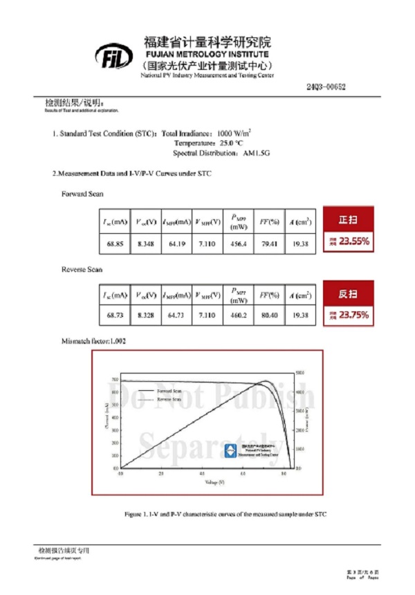 在光伏领域风起云涌的今天,纤纳光电以其独树一帜的技术创新,不断推动钙钛矿产业化向前突破。2024年10月,公司自主研发的冷冻激光修复技术成功助力钙钛矿小组件实现了23.65%(正反扫平均值)的效率并取得福建省计量科学研究院认证证书。